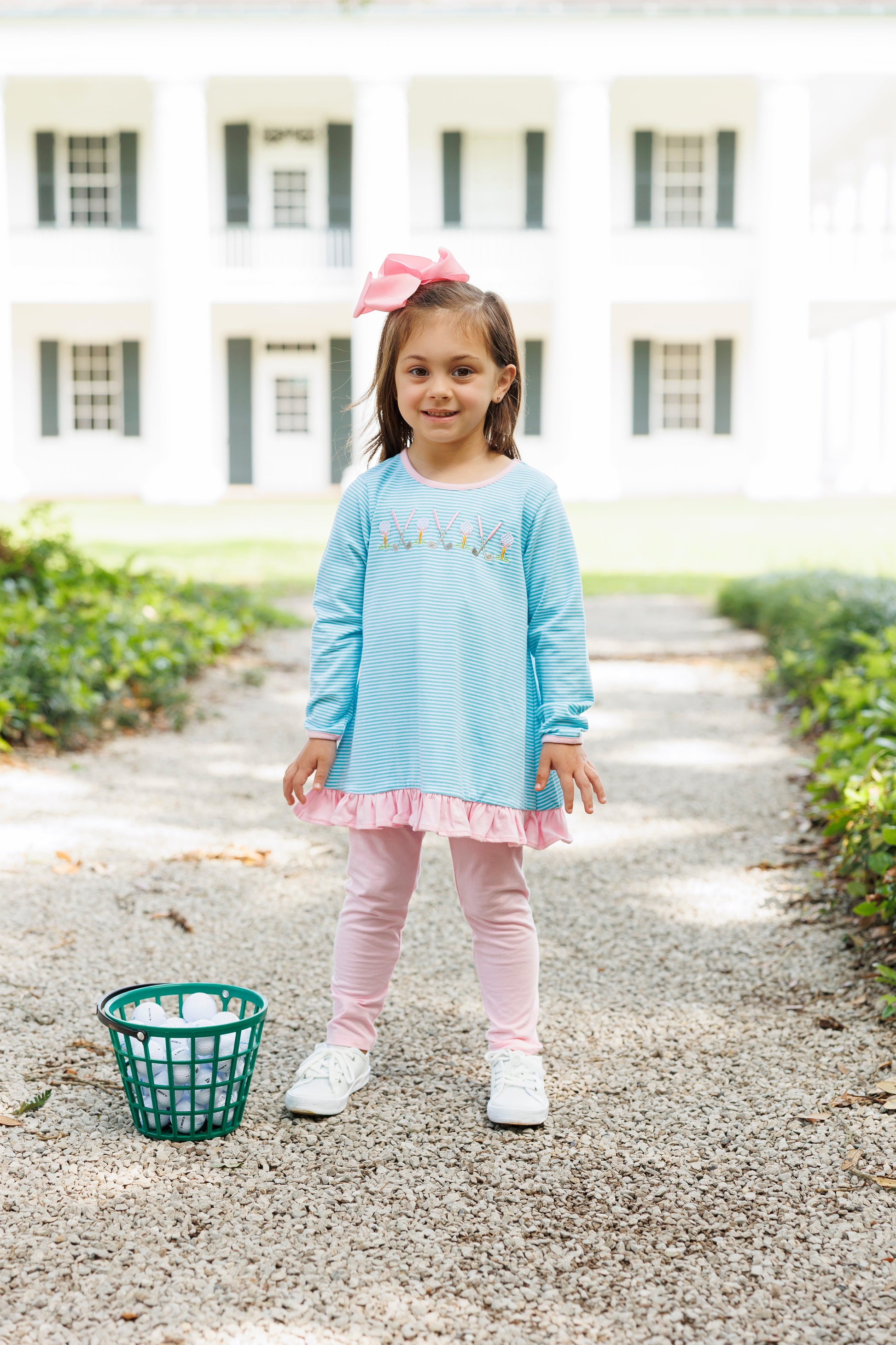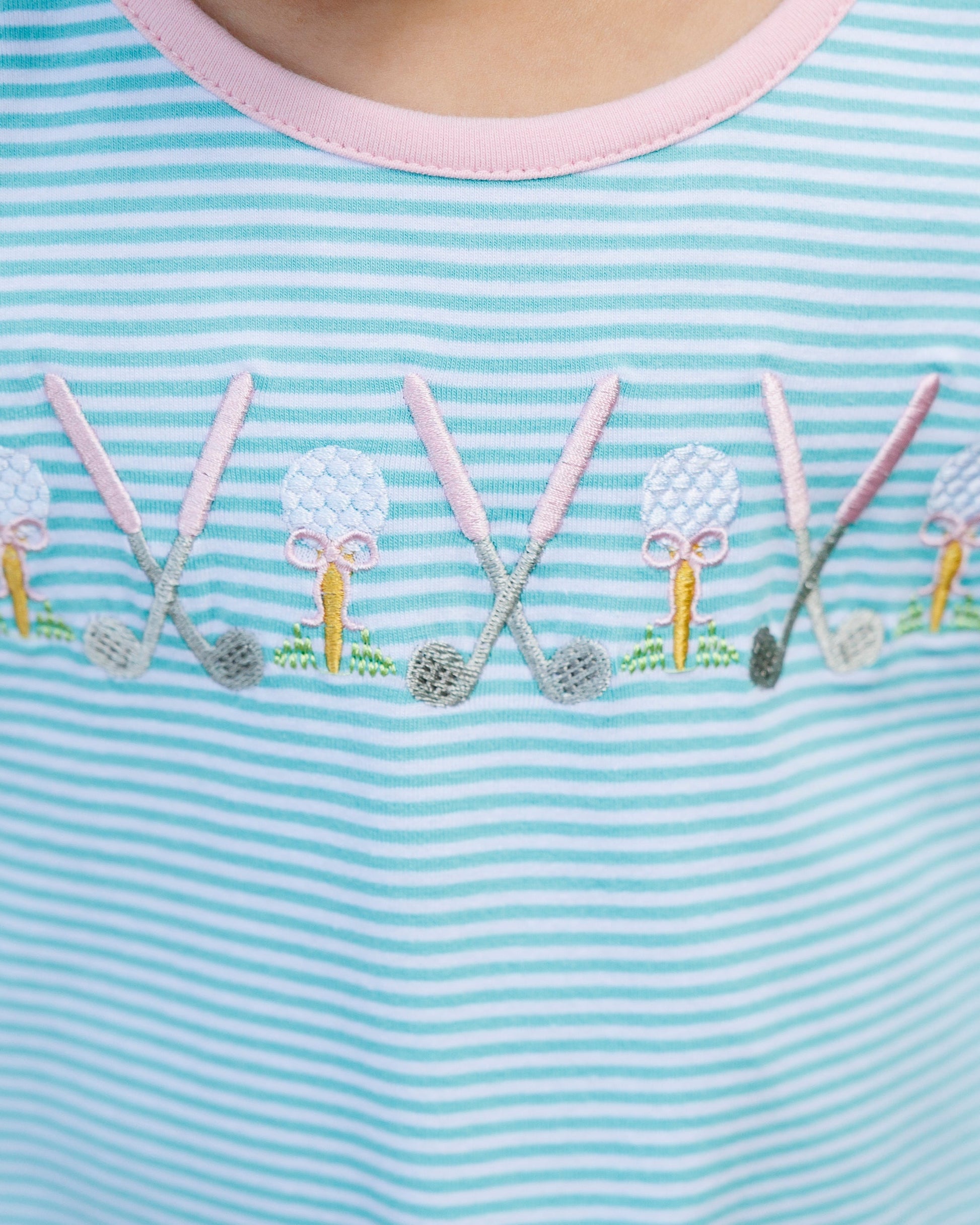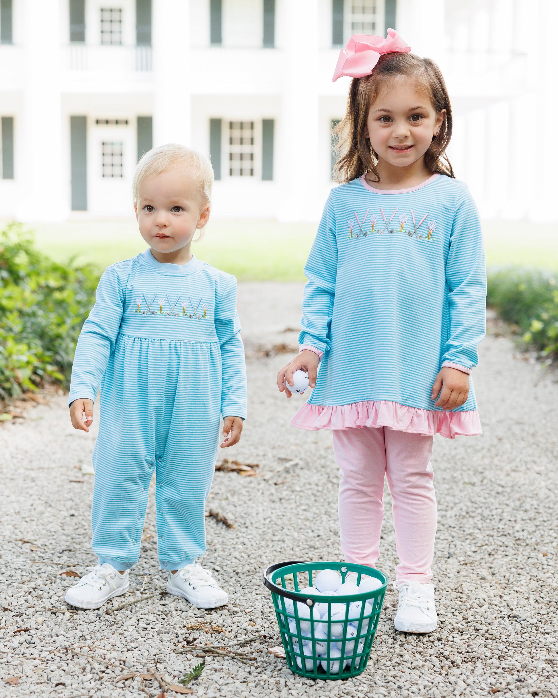Swing into style with our Tee Time Ruffle Pant Set! This playful fall ensemble features a charming striped shirt paired with coordinating pants, adorably embroidered with golf clubs and golf balls. Perfect for your little golfer-in-training to look par-tly adorable on and off the course!