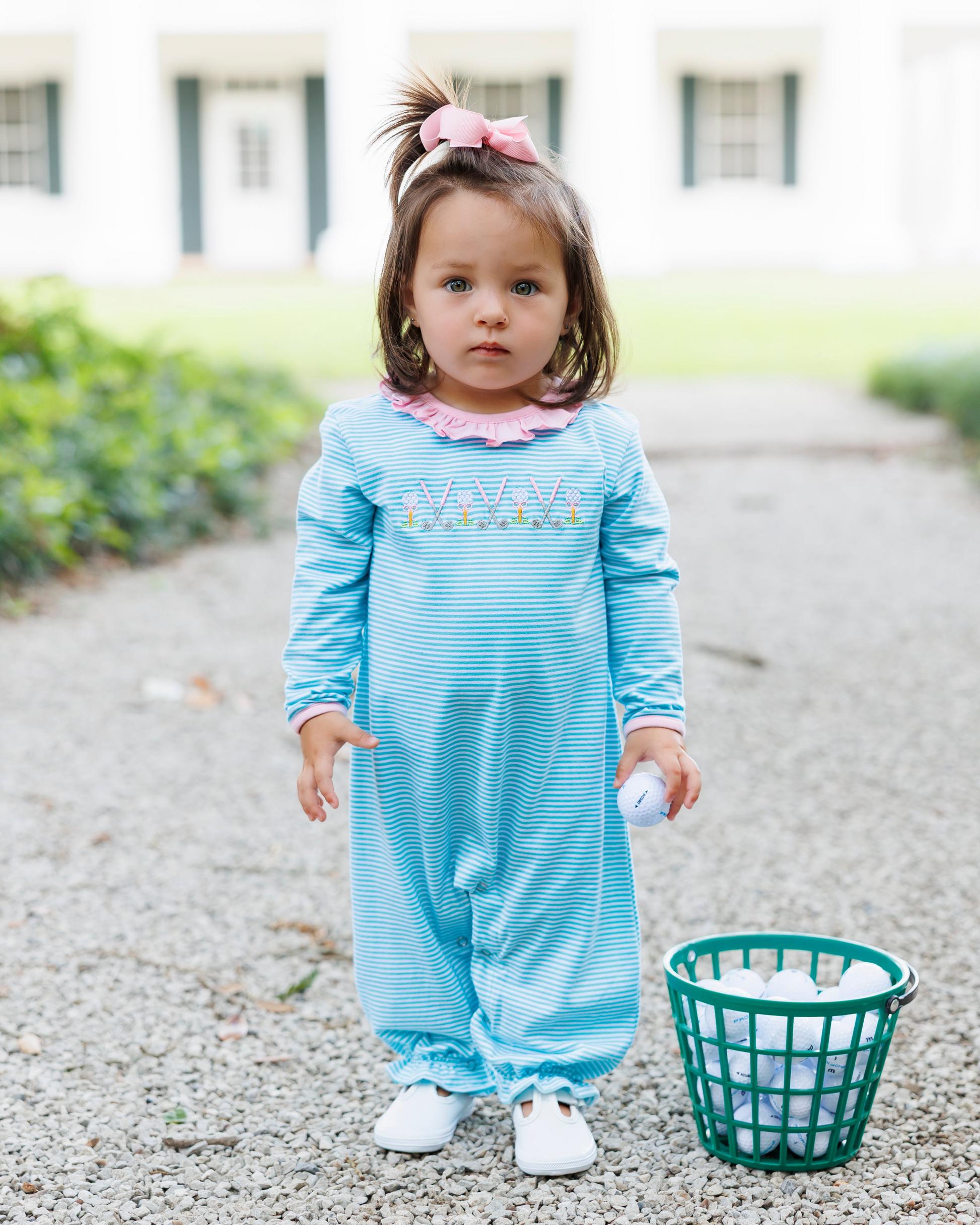 Swing into style with our Tee Time Ruffle Romper! This playful long sleeve romper features a striped print and a ruffle collar, adorably embroidered with golf clubs and golf balls. Perfect for your little golfer-in-training to look par-tly adorable on and off the course!